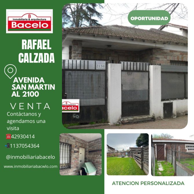 RAFAEL CALZADA - VENTA - Avenida San Martín al 2100 CHALET sobre lote de 10 metros de frente por 35 metros de fondo, jardín, comedor, cocina comedor, 2 dormitorios, baño, quincho, galpón CONSULTAR su valor de venta u$s 145.000 a conversar (se vende su lote lindero) SE ESCUCHAN OFERTAS No deje de visitarnos en www.inmobiliariabacelo.com también puede enviar su consulta a traves de inmobiliariabacelo@hotmail.com o puede enviar un mensaje por WhatsApp o Telegram al 1137054364